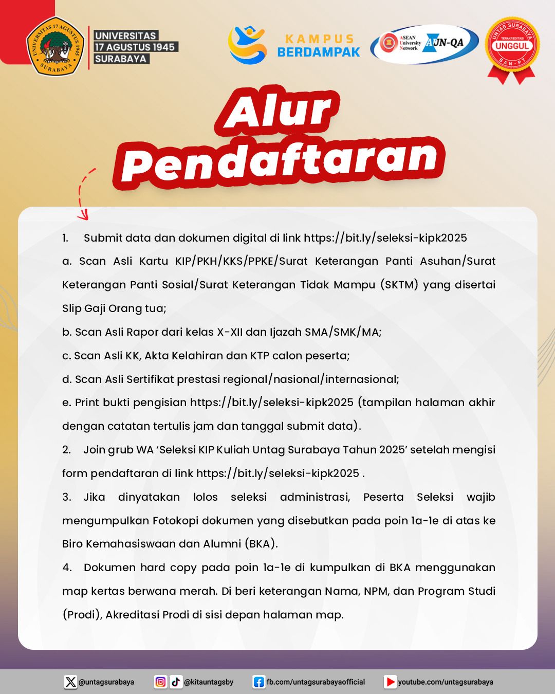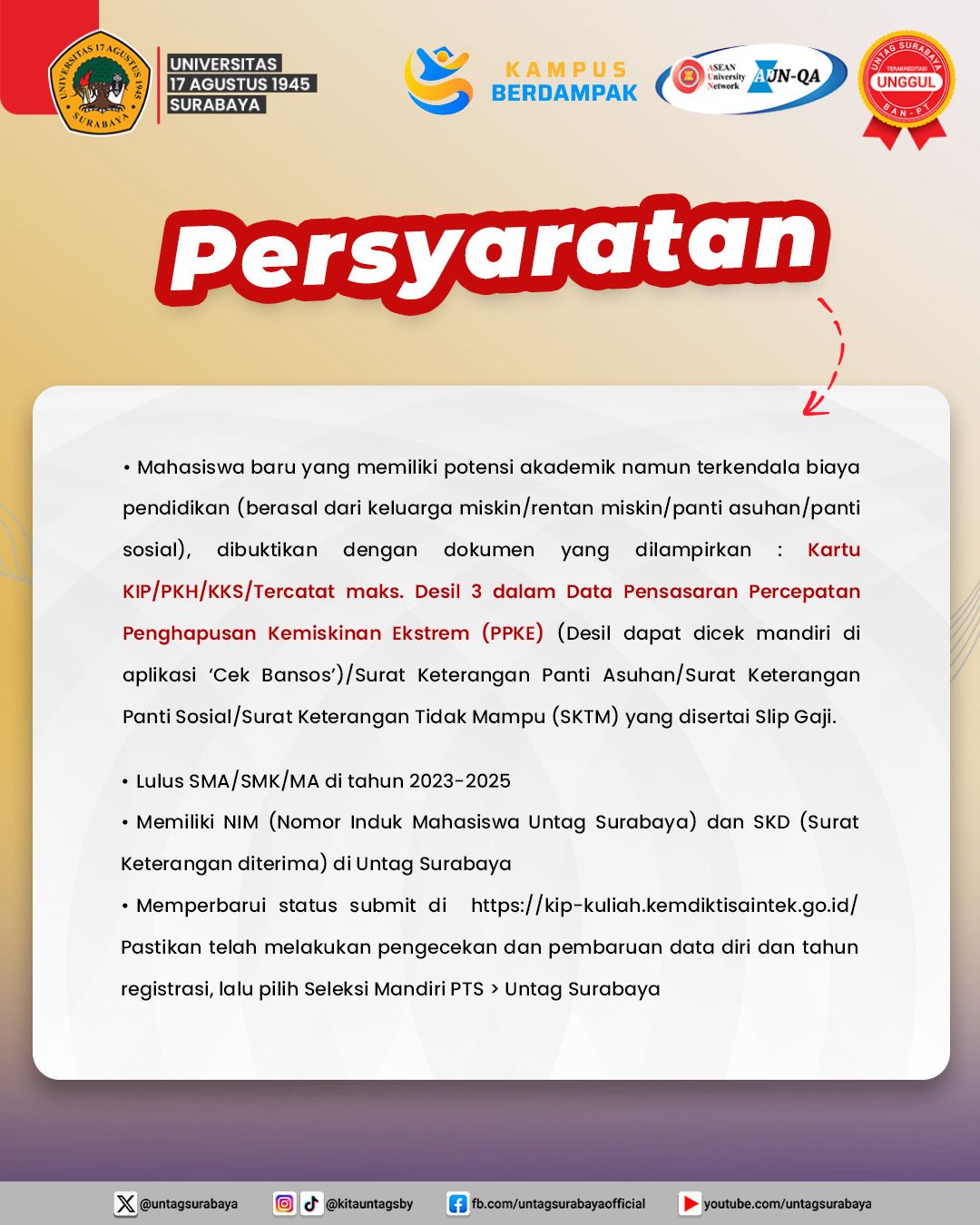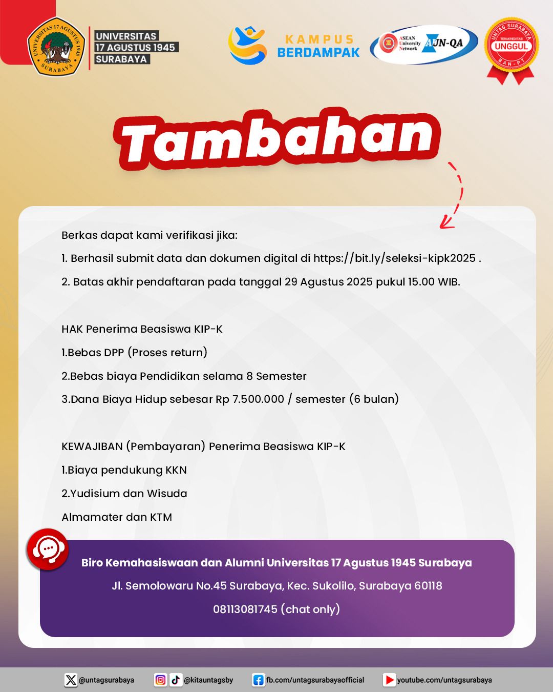 Universitas 17 Agustus 1945 (Untag) Surabaya kembali membuka kesempatan emas bagi calon mahasiswa baru untuk memperoleh pendidikan tinggi melalui Program Kartu Indonesia Pintar (KIP) Kuliah Merdeka 2025. Pendaftaran dibuka mulai 15 – 29 Agustus 2025 dan dapat ditutup sewaktu-waktu apabila kuota telah terpenuhi.