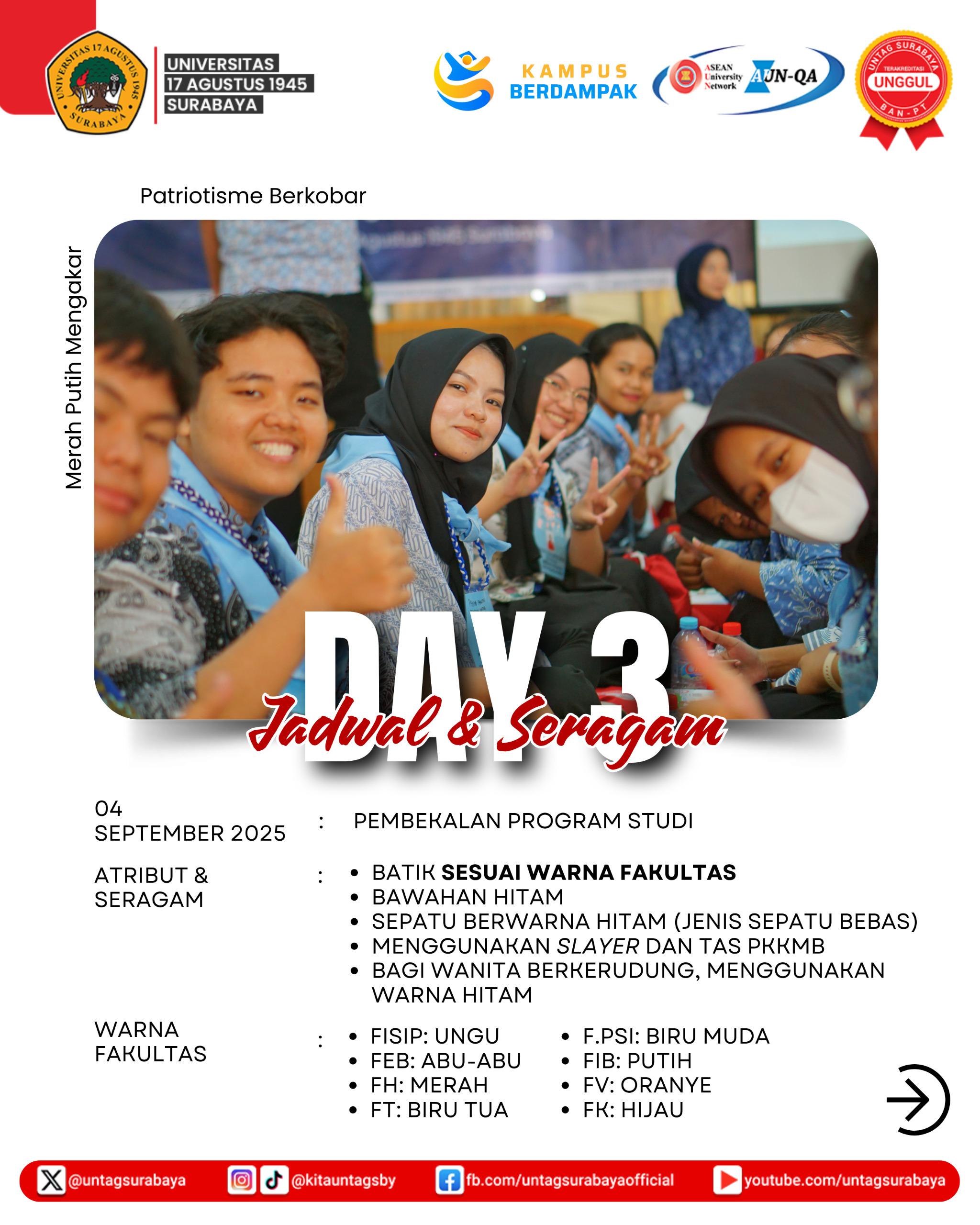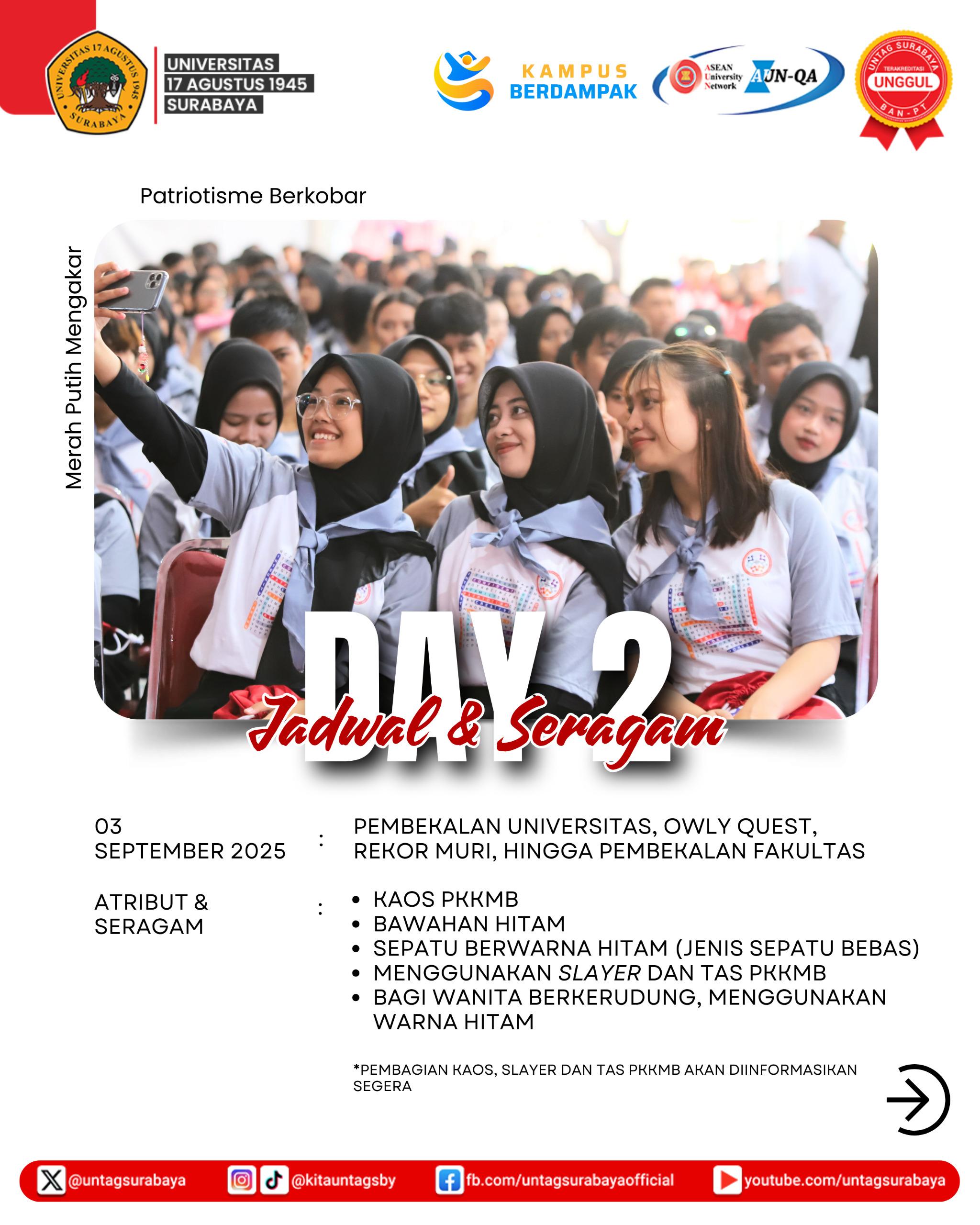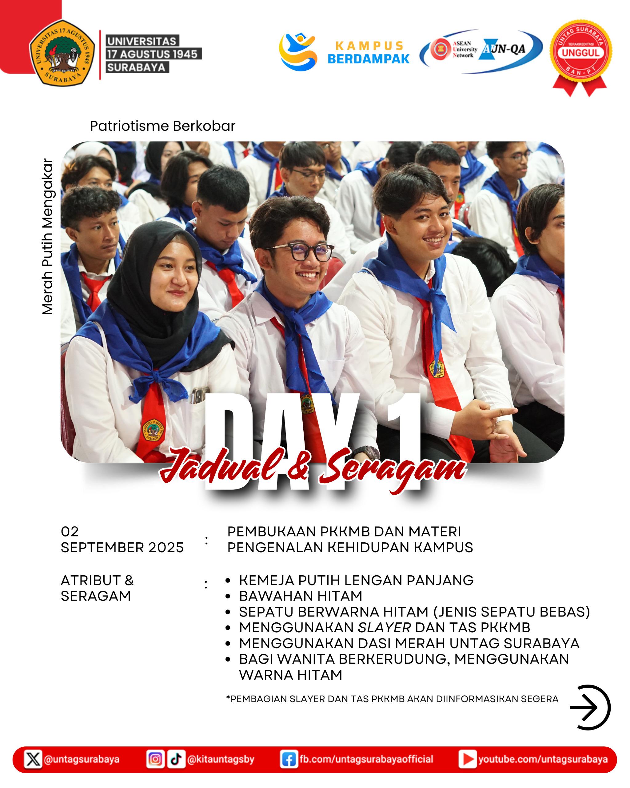 Universitas 17 Agustus 1945 (Untag) Surabaya telah menyiapkan rangkaian kegiatan Pengenalan Kehidupan Kampus bagi Mahasiswa Baru (PKKMB) 2025 yang akan berlangsung mulai 2 September hingga 4 Oktober 2025. Acara ini diawali dengan pembukaan resmi dan materi pengenalan kehidupan kampus pada 2 September. Dilanjutkan pada 3 September dengan pembekalan tingkat universitas, kegiatan Owly Quest, pencatatan rekor MURI, serta pembekalan fakultas.