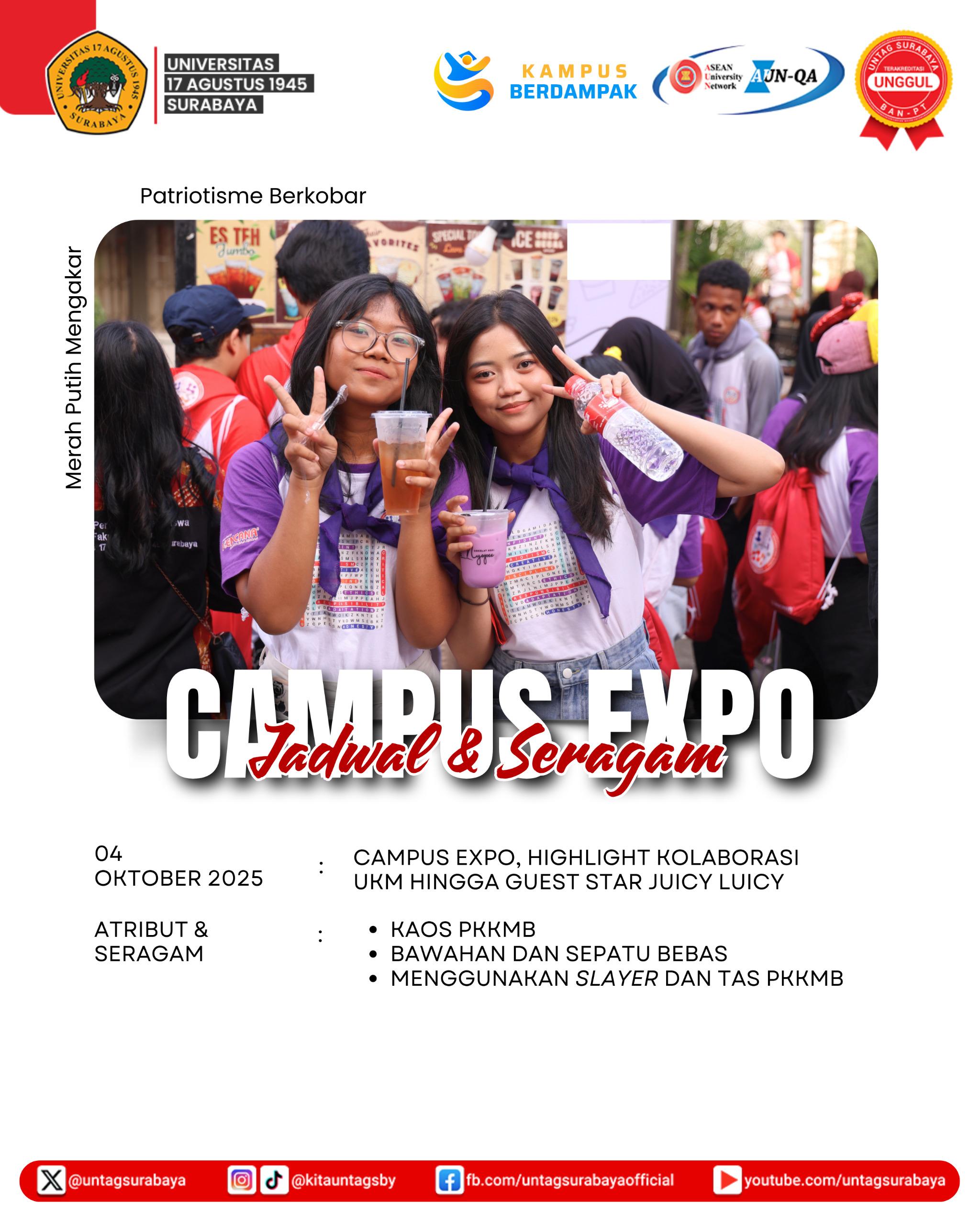 Pada 4 September, mahasiswa baru akan mendapatkan pembekalan khusus program studi untuk memahami bidang akademik yang akan mereka jalani. Sementara pada 6 September, akan dilaksanakan pengenalan Unit Kegiatan Mahasiswa (UKM) dan Badan Eksekutif Mahasiswa Universitas (BEM-U), yang diakhiri dengan pengukuhan mahasiswa baru. Rangkaian PKKMB akan ditutup dengan Campus Expo pada 4 Oktober 2025, yang menampilkan berbagai informasi jurusan, kegiatan seni budaya, dan hiburan menarik. Kegiatan ini menjadi langkah awal yang penuh semangat bagi mahasiswa baru untuk mengenal, beradaptasi, dan menjadi bagian dari keluarga besar Untag Surabaya.